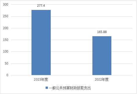 2023年度一般公共预算财政拨款支出277.4万元,占本年支出合计的100%。与2022年度相比,一般公共预算财政拨款支出增加111.52万元,增长67.23%。主要变动原因是本年度新增项目《泸州烈士英名录》编纂及印刷支出49万元;本年度完成提升改造工程的质保金及代建费支出。