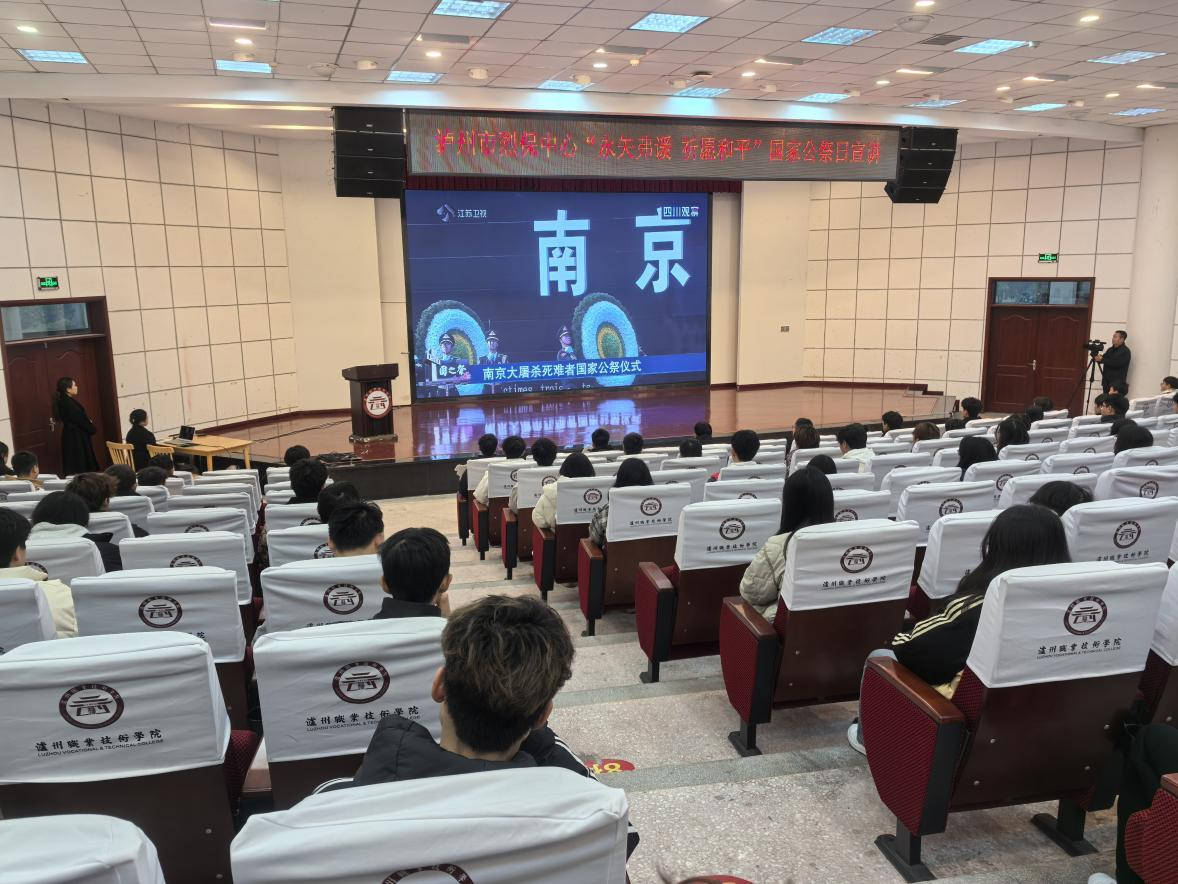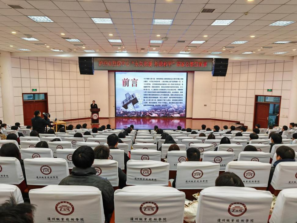 12月13日,为深切缅怀南京大屠杀的无辜死难者,缅怀所有惨遭日本侵略者杀戮的死难同胞,缅怀为中国人民抗日战争胜利献出生命的革命先烈和民族英雄,泸州市烈士纪念设施保护中心在泸州市职业技术学院开展国家公祭日“永矢弗谖 祈愿和平”主题活动。
