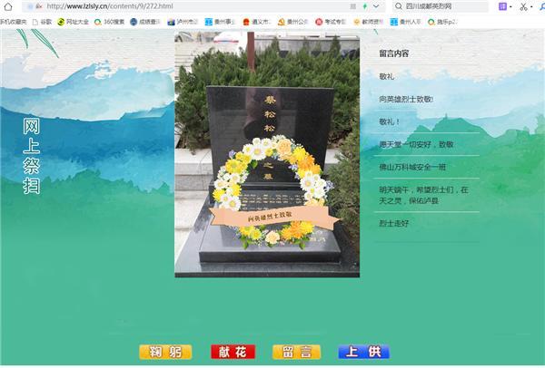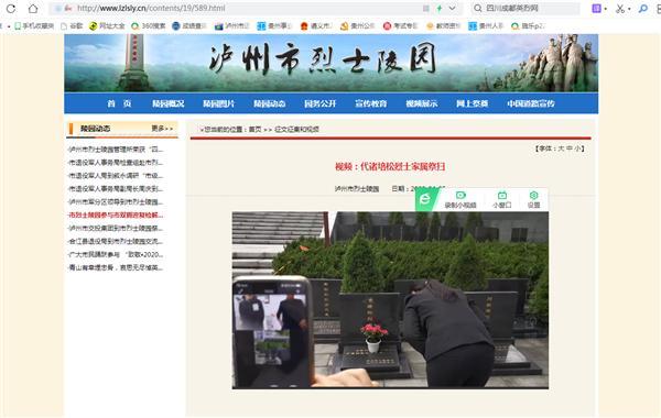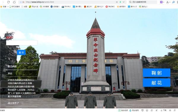 为了更好的做好褒扬烈士工作,市烈士陵园创建了“泸州—致敬.2020清明祭英烈”专题窗口,可通过“泸州退役军人”微信公众号和“泸州市烈士陵园”网站进入专题。打开专题上“网上祭奠”页面,即可向革命烈士敬献鲜花,鞠躬和上供,也可收看宣讲视频和征文。