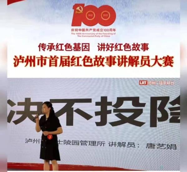 泸州市烈士陵园管理所讲解员唐艺娟参与了此次比赛,她讲述了在征粮剿匪中牺牲的优秀共产党员,泸县牛滩区副区长罗伯骥的感人故事,得到了观众们的共鸣。唐艺娟说:“红色故事并不是老一辈的专属,每一个红色讲解员不仅应该成为红色故事的讲解着,更应该成为传承者,用年轻人熟悉的方式讲给年轻人听,让英雄故事永续,让红色薪火代代相传。”